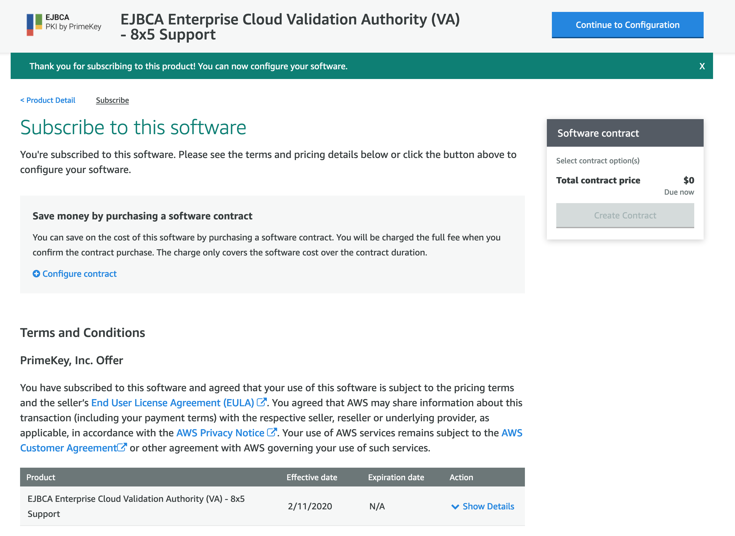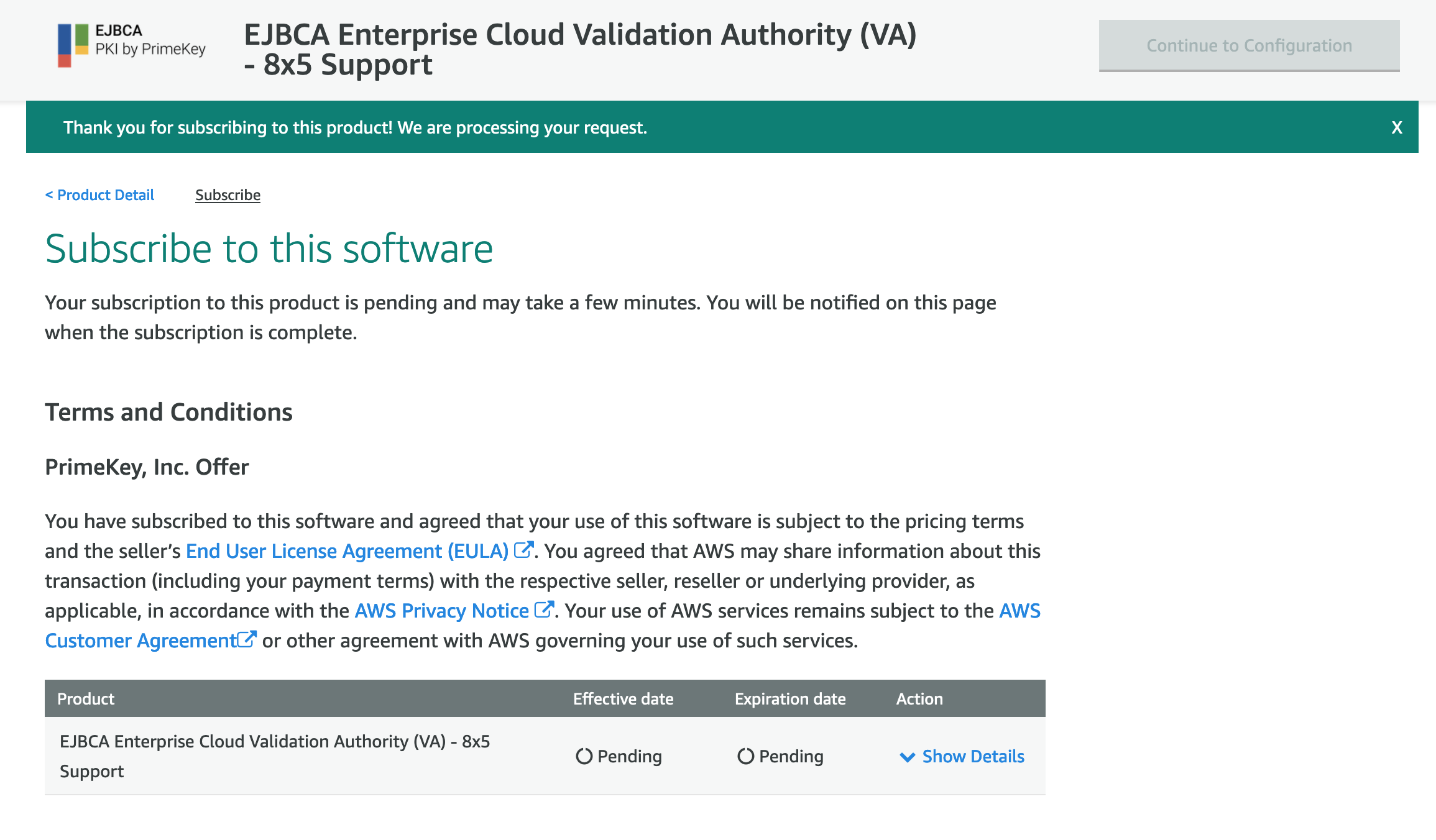 - Once completed, the Continue to Configuration button is enabled and the date you subscribed to the software is displayed.