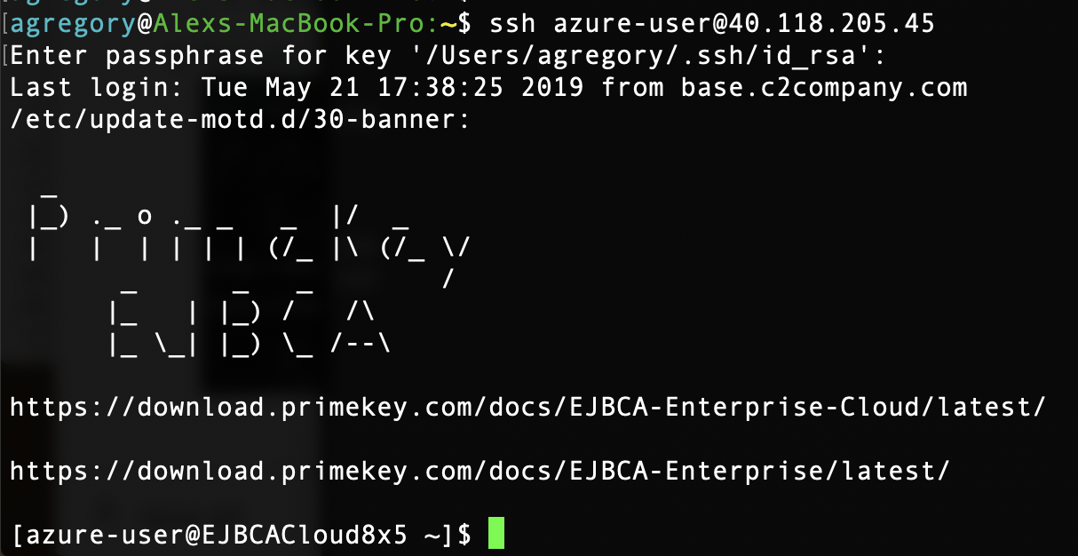 - If you selected ssh key access when procuring your instance, use the SSH key that you selected when procuring the instance. If you chose username and password, use the combination you chose at launch time to SSH into the EJBCA Cloud instance. For example, for azure-user with an IP address of 40.118.253.3 use the following: BASH
