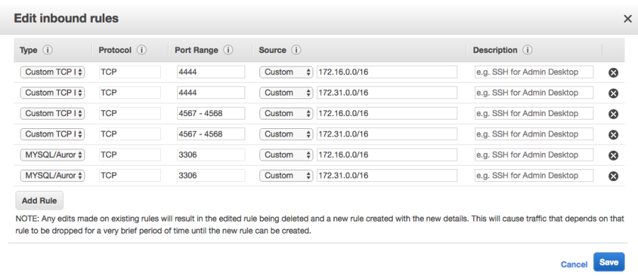 This will allow any connections outbound to any address and any inbound connection on ports 3306, 4567, 4568 and 4444 from any address on the 172.16.0.0/16 and 172.31.0.0/16 subnets. The same rule in the other VPC will also need the same rule configured. These rules may be tightened as required for the organization.