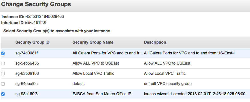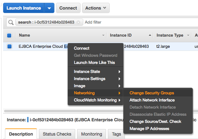 - To apply these Security Groups to the EJBCA Enterprise Cloud Nodes in each of the VPCs, right-click the node, select Networking and then ChangeSecurityGroups.