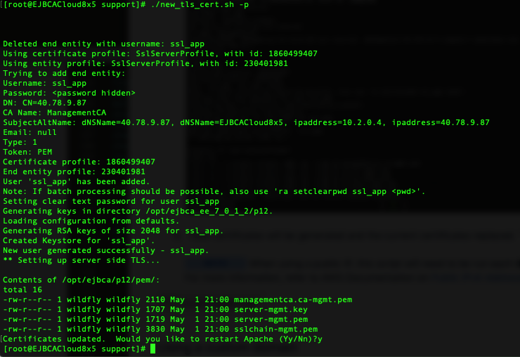 - New certificates will be generated and the current certificates replaced. These will then be rotated into place and the script will prompt to restart Apache.