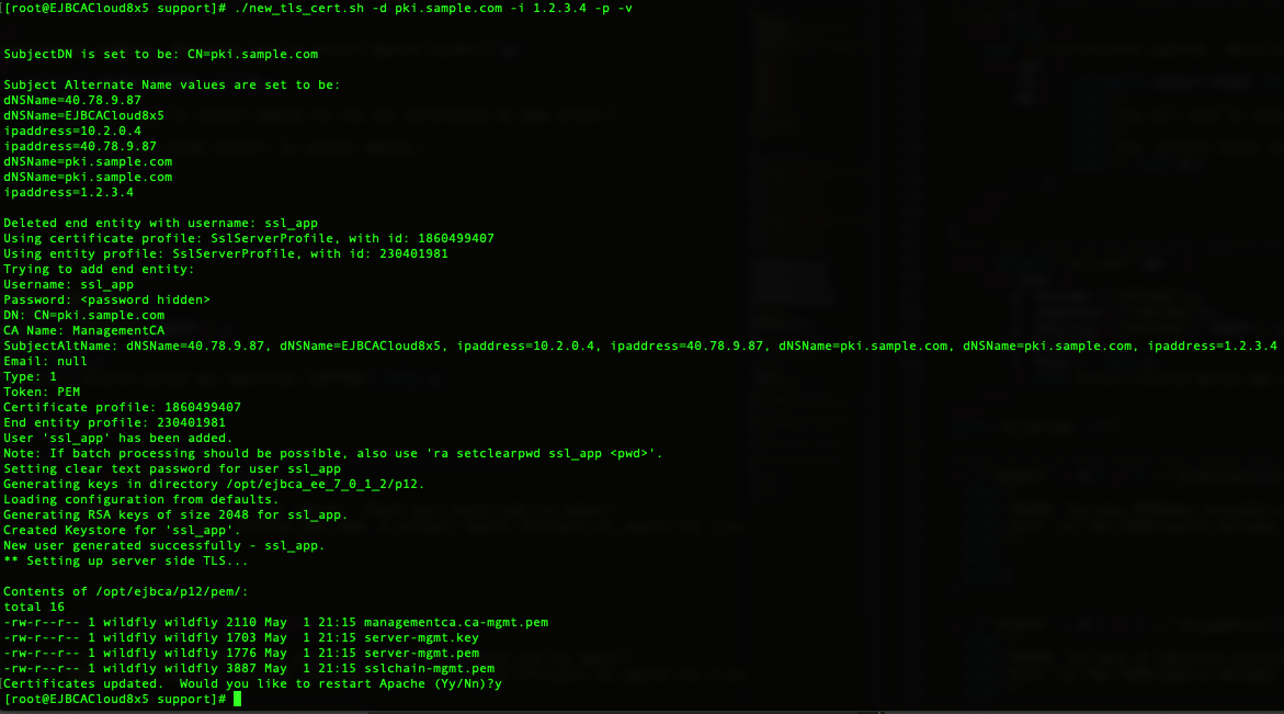 new_tls_cert.shscript followed by your domain to generate new certificates with the current Public or Elastic IP and your custom DNS value. The following example uses the domainpki.sample.comand the IP address1.2.3.4. When using this method, it is recommended to assign a dedicated elastic IP before running this command, but not required:Options used in the command:CODE# cd /opt/PrimeKey/support # ./new_tls_cert.sh -d pki.sample.com -i 1.2.3.4 -p -v-d: To add a custom domain to the certificate.-i: To specify a custom IP address.-p: To add the nodes public IP information assigned to it by AWS automatically.-v: For verbose output to show all of the domains being added to the certificate. - In the output below, with the verbose option, we see that the first and second FQDNs are the public and internal FQDNs from Azure.
