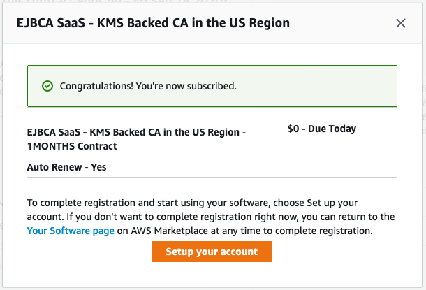 Review the confirmation showing that the subscription was successful and click Setup your account to be redirected to the EJBCA SaaS Portal.
