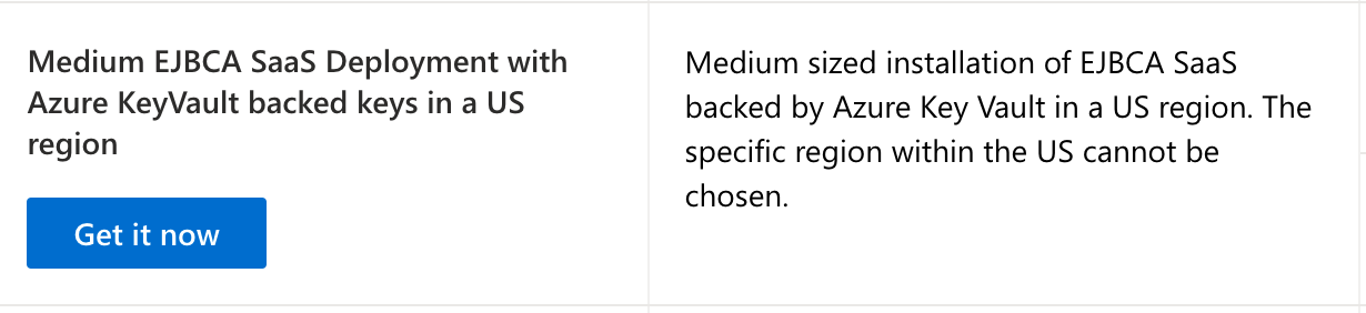 - Click the product listing desired. For example, if the U.S. region of Azure is desired to have the PKI deployed to, and the desired size is a Medium, select the Medium EJBCA SaaS Deployment with Azure KeyVault backed keys in a US region product option and click Get it Now.