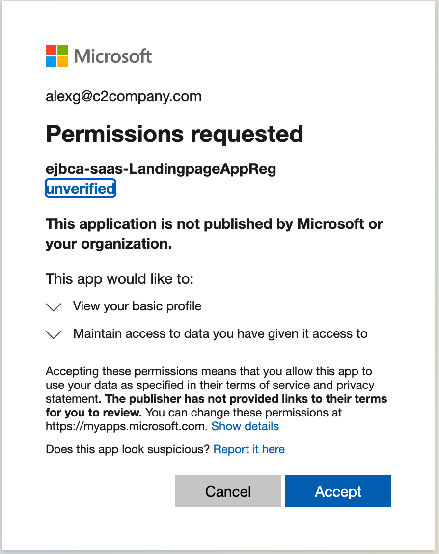- You are redirected to a new page to grant permissions to the SaaS landing page. Click Accept.