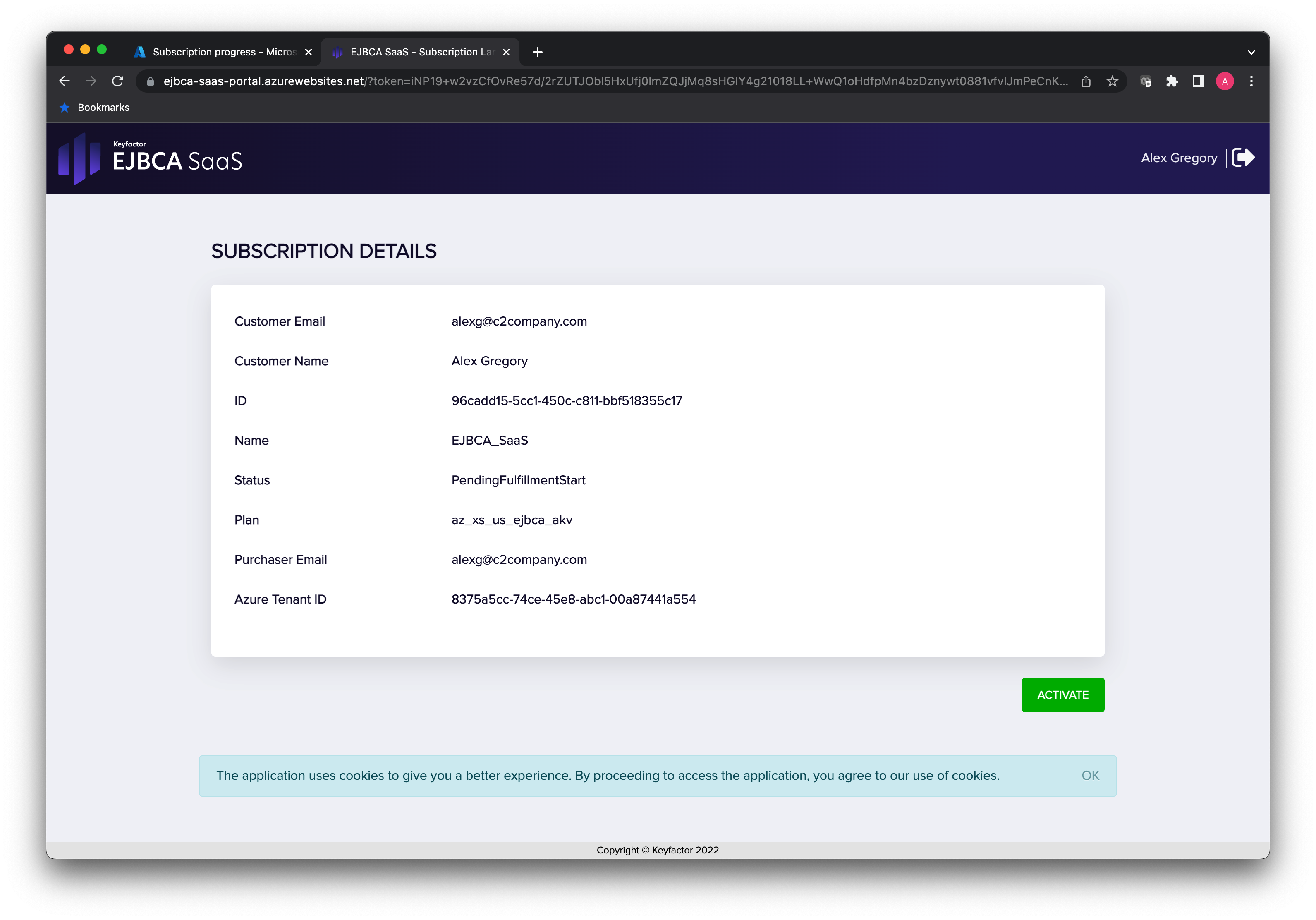 - On the page that shows the details of the subscription, click Activate.