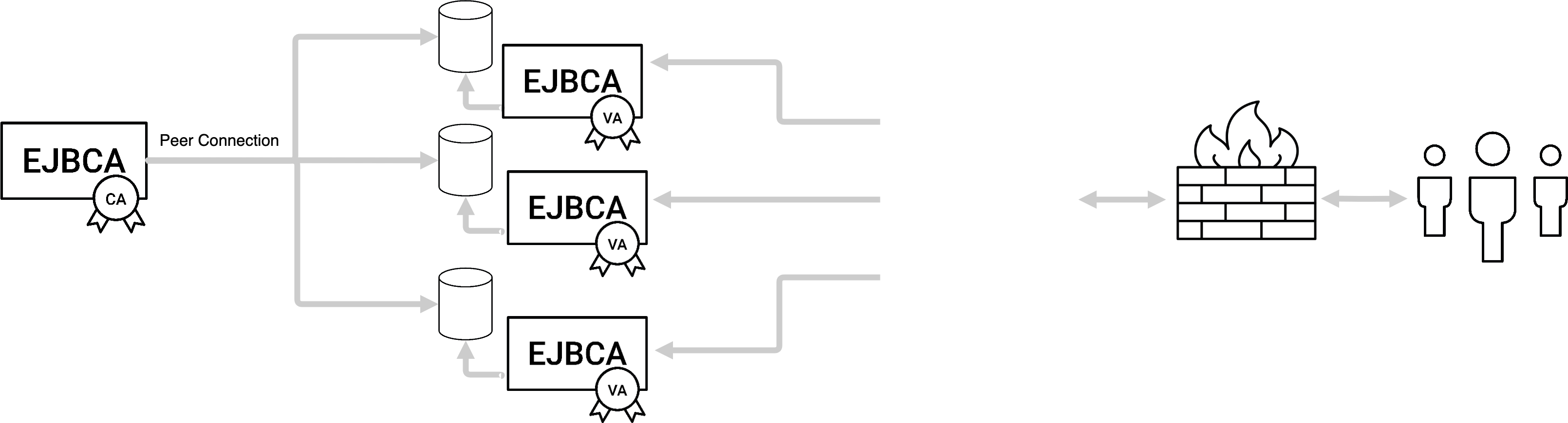 For very large installations, clustering may be used between VAs located on the same site. EJBCA can then publish to only a single VA on each site using a Multi Group Publisher to minimize the amount of outbound traffic.