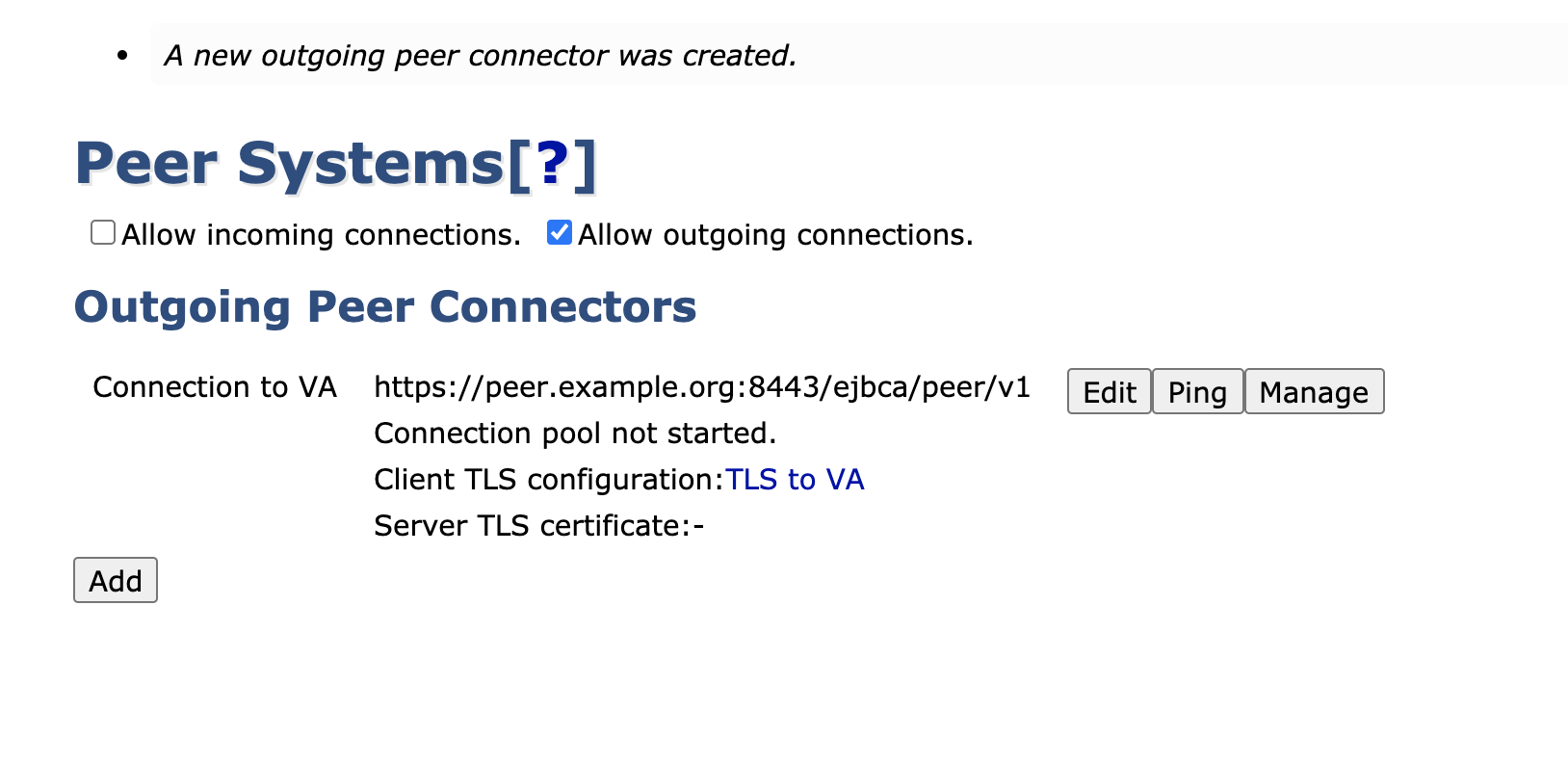 - In the CA UI, click Peer Systems in the menu to view the Peer Systems Management page, then click Add to create a new Outgoing Peer Connection