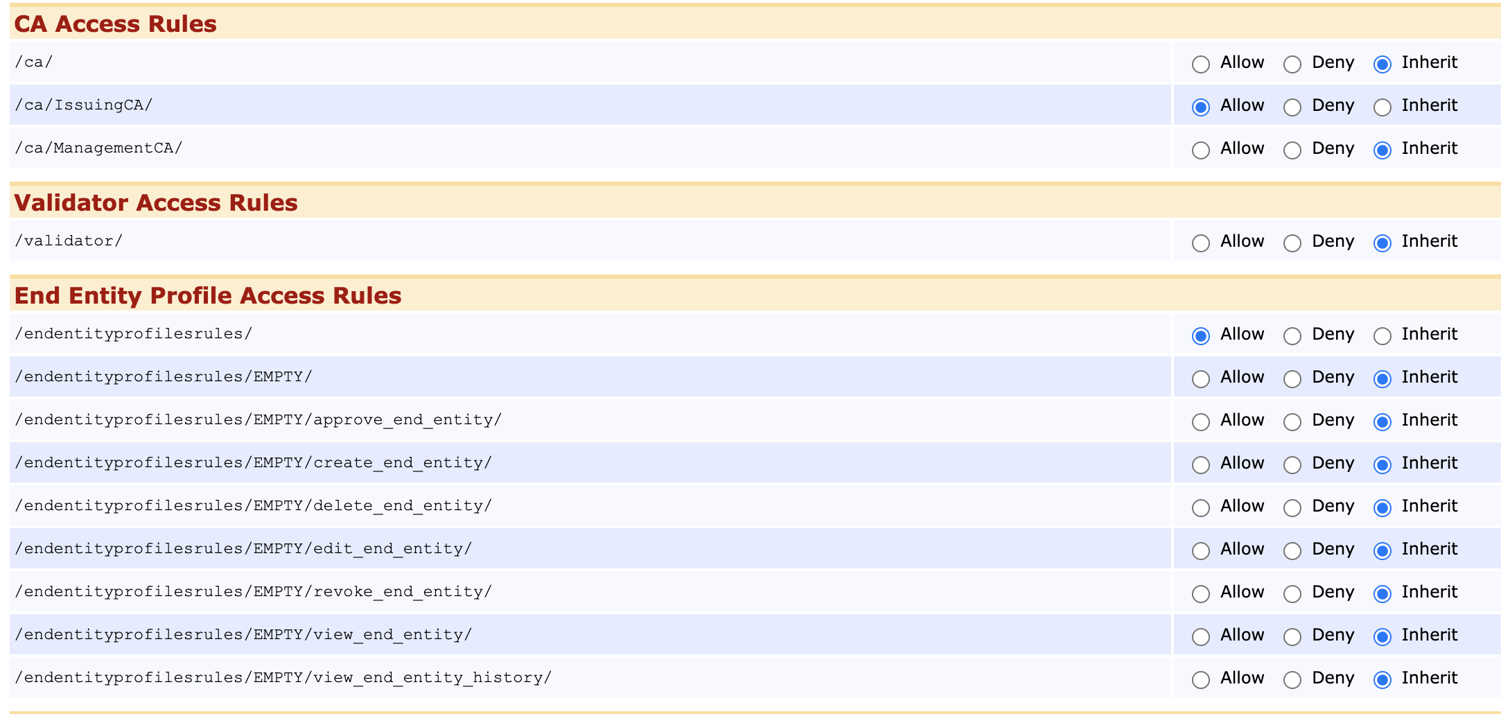 • Access to the CAs and End Entity Profiles that you wish to be publicly accessible. For more details, see RA Administrator Access Rules.