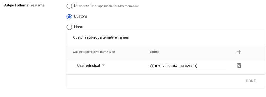Specify a SCEP profile name, Subject name format, and Key size. The following example is focused on issuing device certificates, but can easily be adapted for user certificates: ยจ CSR subject fields are defined in the SCEP profile. Placeholder variables can be used in order to customize the CSR to the need. For available placeholder variables, refer to the Google Help article Set up digital certificate provisioning.