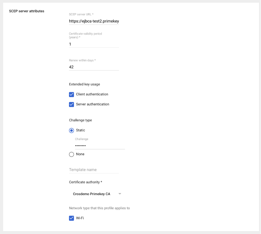 Challenge type: The static challenge (pass-phrase) used to authenticate the request coming from the Google Cloud Certificate Connector on the SCEP server and the corresponding certificate authority.