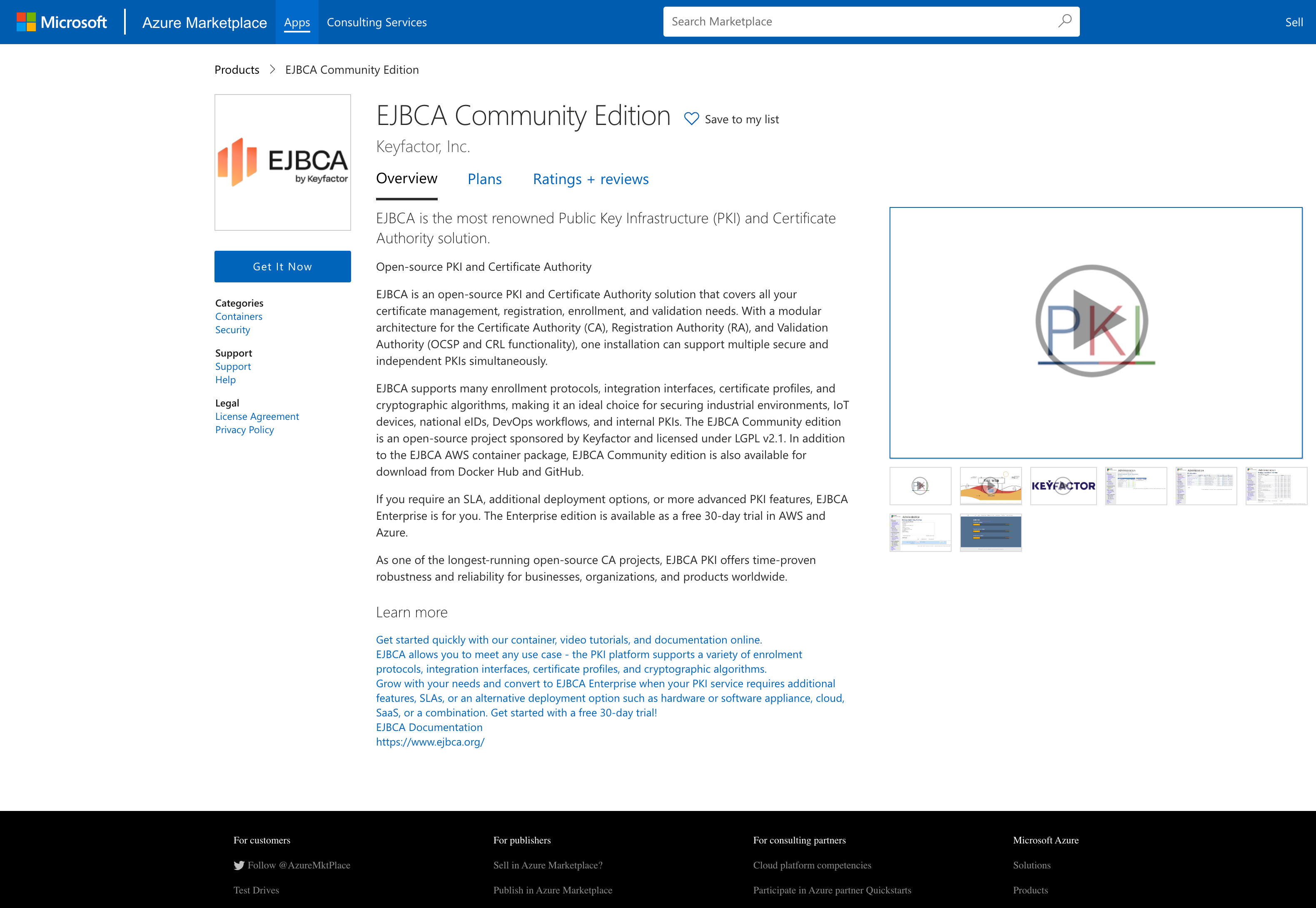 - Click Get It Now to start the subscription process to the EJBCA Community container in Azure: