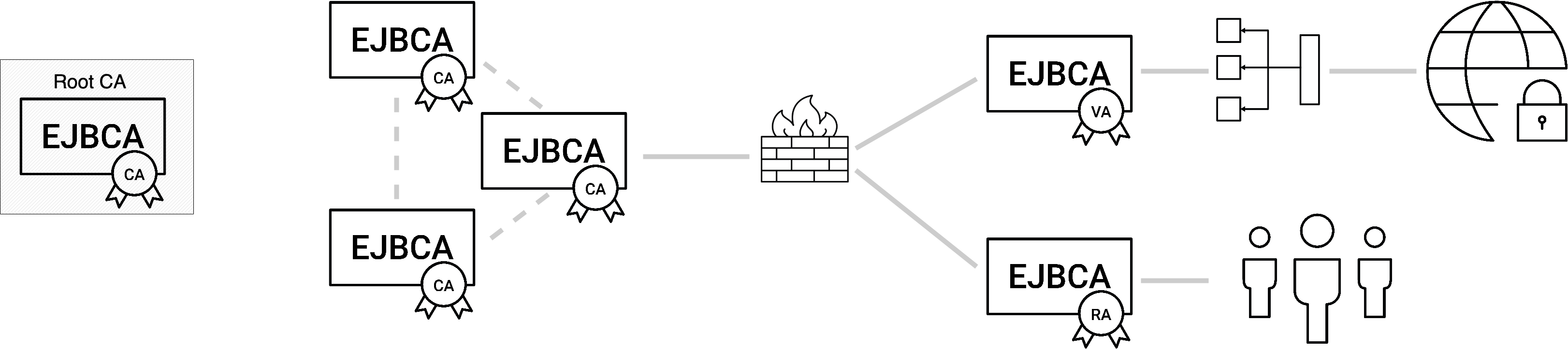 Domain security is of great importance. Your VAs will likely have to be exposed to the internet at large to supply CRLs and answer OCSP requests, while your RAs will at minimum have to be exposed internally to your general network to allow users and servers to enroll for certificates, or at worst to the internet at large if you're planning on issuing certificates to third-parties. While it might be tempting to simply have all your instances in the same domain, it is very much recommended to keep your CAs behind a one-way firewall, allowing only outgoing connections. EJBCA solves this using the Peers protocol, which not only uses mutually authenticated TLS but also has the CA initiate all connections.