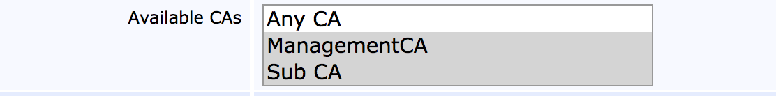 Certificate profiles can also be restricted to only work under a limited subset of CAs. Setting this value also limits the visibility of the profile to those users who have rights to all chosen CAs.