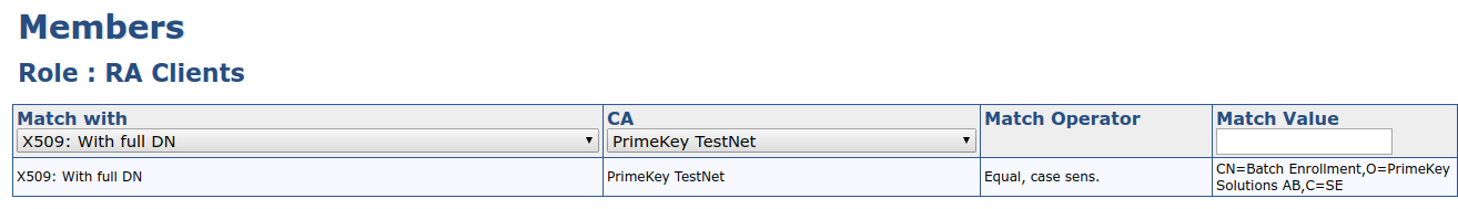 Next, give the RA client certificate access to perform RA functions on the CA. Do this by creating a new role member in EJBCA.