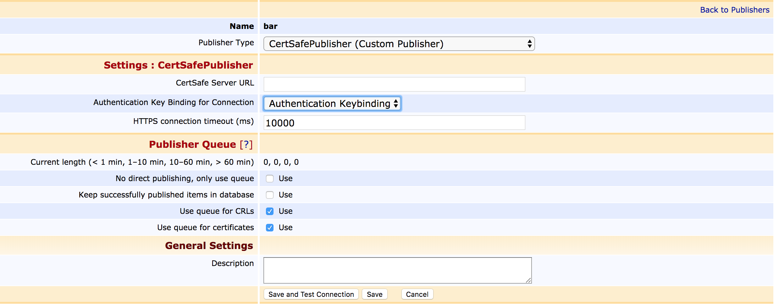 - Publisher Type: CertSafePublisher (Class Path: (not modifiable) org.ejbca.core.model.ca.publisher.CertSafePublisher).