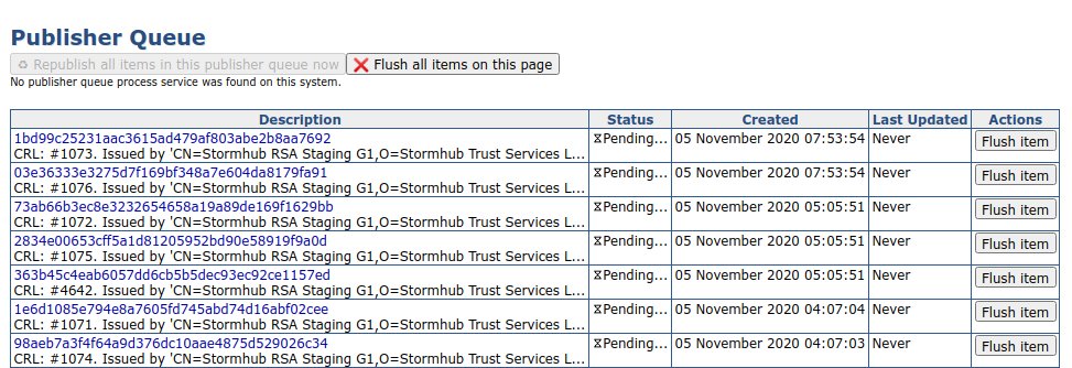 To view more information about the items in a publisher queue, click on the number shown in the Length column. On this page, it is also possible to remove (Flush) and republish the items. For more information on managing the publisher queue, see Publisher Queue.