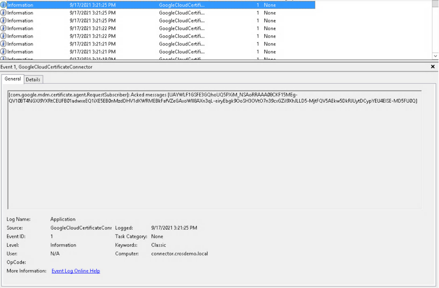 On the Google Cloud Certificate Connector event viewer, look for the following events: