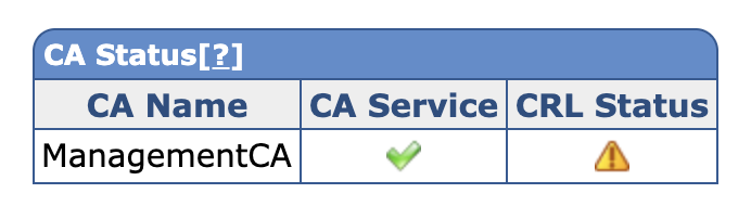 - CRL Status: A red error indicates that a CRL or delta CRL has expired without a new one being created. Note that delta CRLs are only monitored if used. For information on generating new CRLs, see CRL Generation.