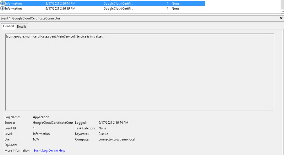 On the Google Cloud Certificate Connector event viewer, look for the following events: