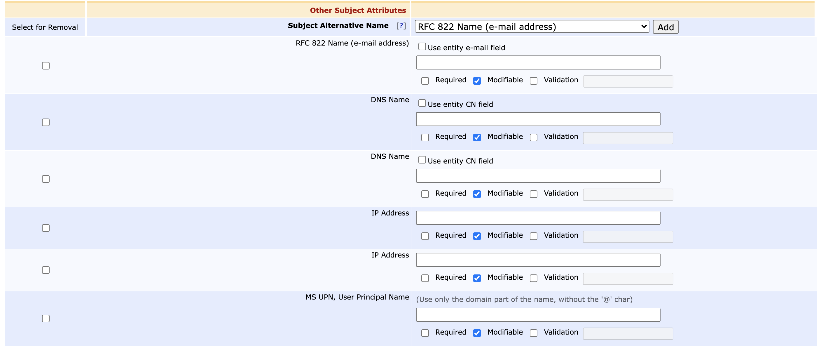 Ensure that the following Subject DN Attributes and Subject Alternative Names values are available in the End Entity profile (EJBCA RA Functions > End Entity Profiles):