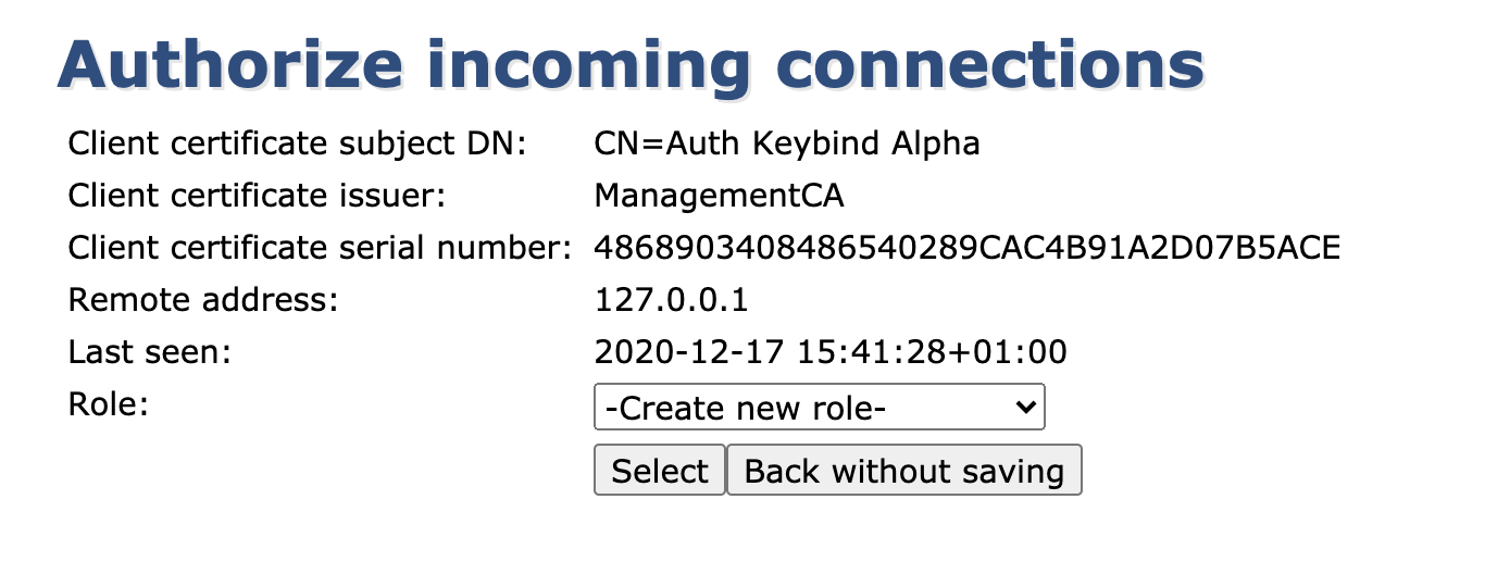 - If you already have a role prepared with the required authorizations then feel free to pick it, and the TLS certificate in the Authentication Key Binding will be added to that role. I