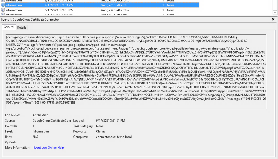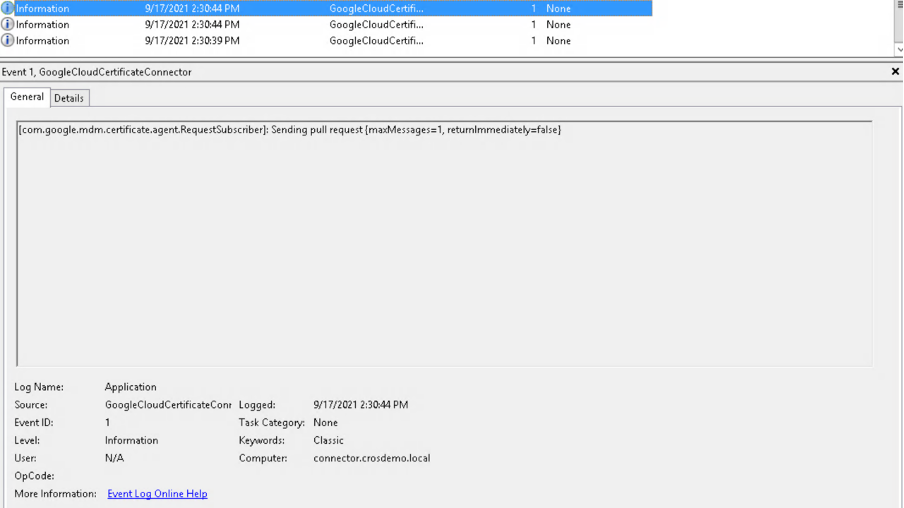 On the Google Cloud Certificate Connector event viewer, look for the following events: