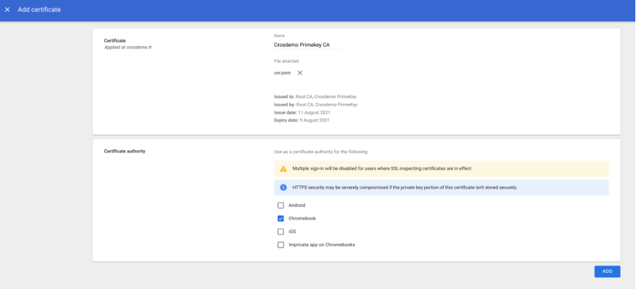 Under Devices > Networks > Certificates, click Add certificate. This should be done at the root of the Google domain or for Chromebooks root OU
