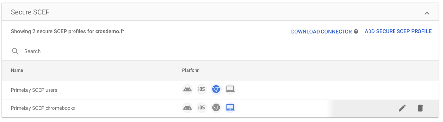 Under Devices > Networks > Secure SCEP connector, select Add Secure SCEP Profile. This can be done at the root domain level, at Chromebooks root OU in case of device certificates, or Users root OU in case of user certificates.