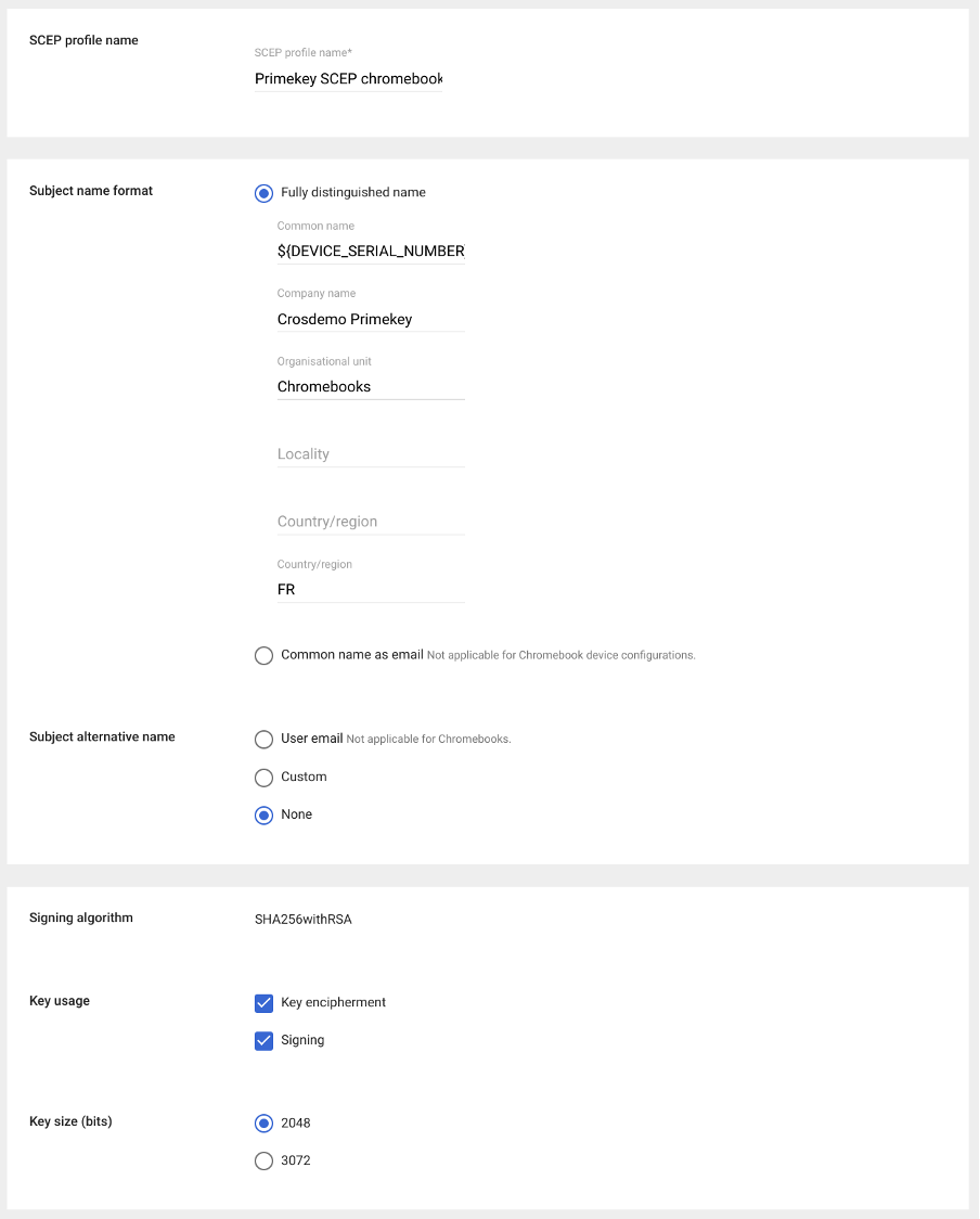 Specify a SCEP profile name, Subject name format, and Key size. The following example is focused on issuing device certificates, but can easily be adapted for user certificates: ยจ CSR subject fields are defined in the SCEP profile. Placeholder variables can be used in order to customize the CSR to the need. For available placeholder variables, refer to the Google Help article Set up digital certificate provisioning.