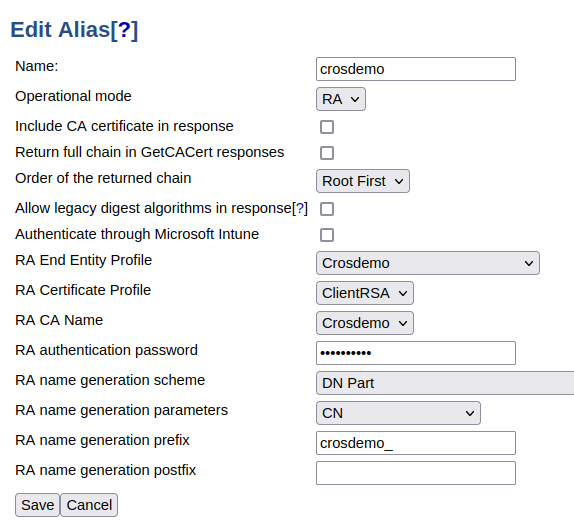 SCEP server URL: The URL of the SCEP server should look something like: https://<hostname>:<port>/ejbca/publicweb/apply/scep/<alias>/pkiclient.exe.