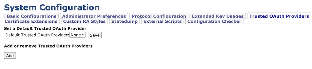 The OAuth configuration page is found under the Trusted OAuth Providers tab in System Configuration.