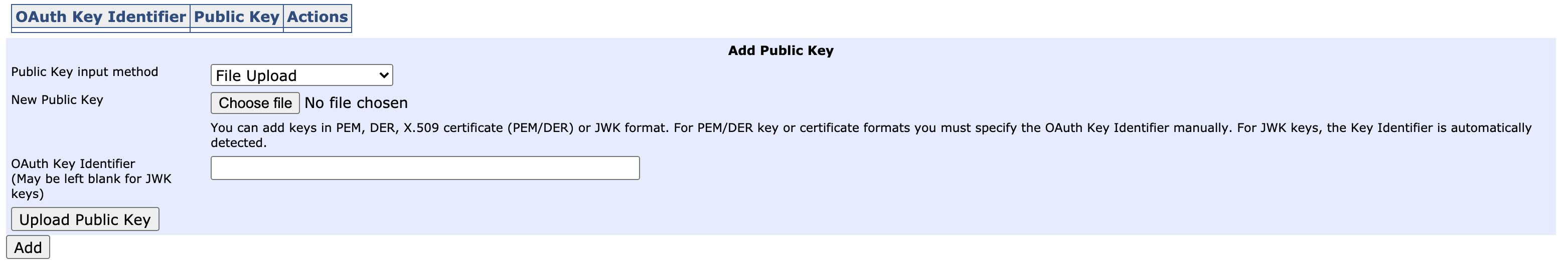 At the bottom of the page is a form for providing the OAuth public key: