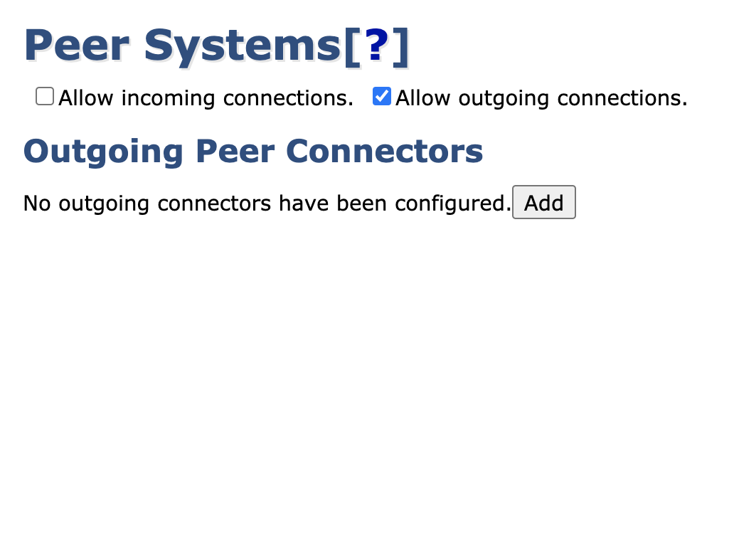 - In the CA UI, click Peer Systems in the menu to view the Peer Systems Management page, then click Add to create a new Outgoing Peer Connection