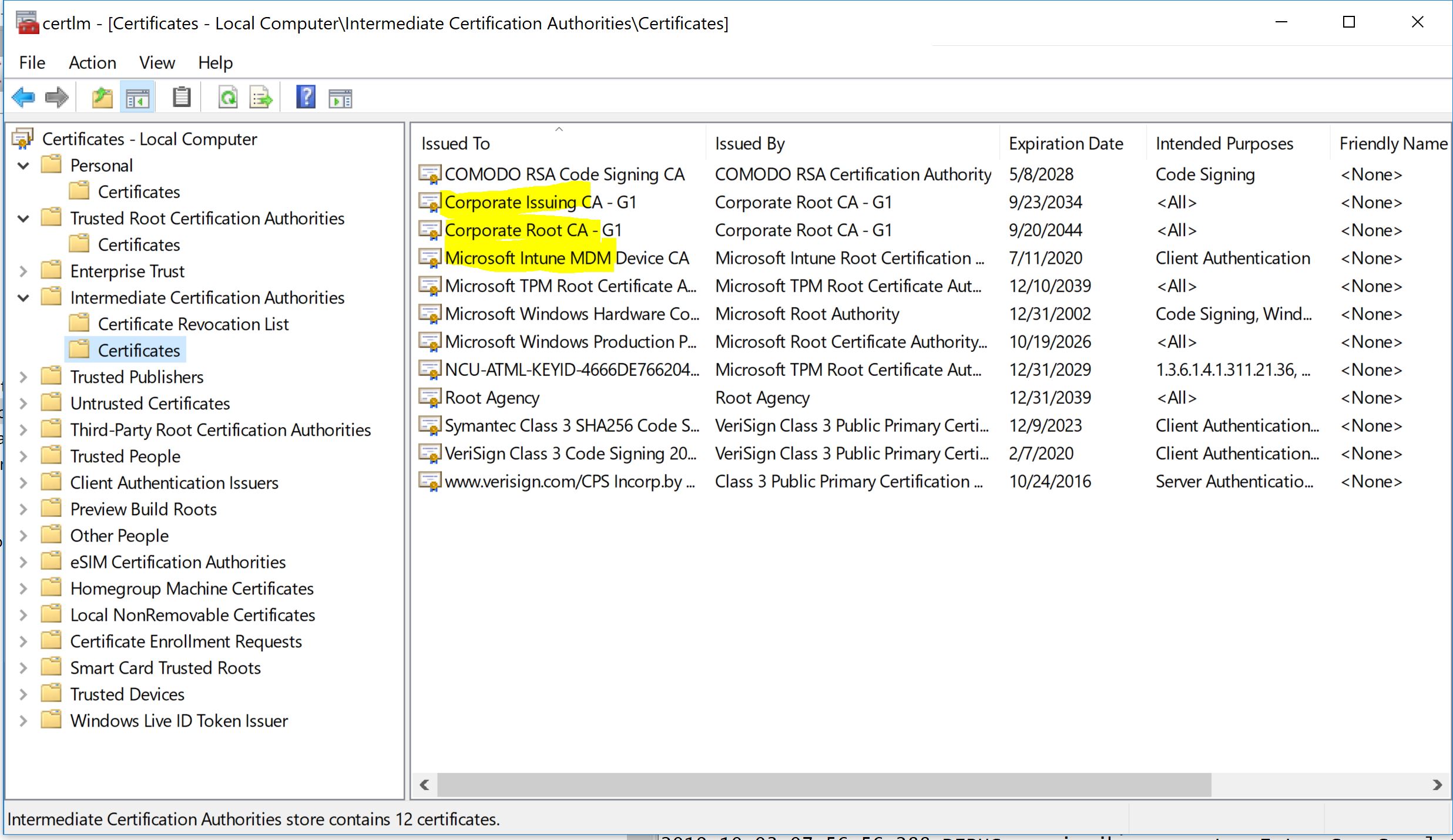 - Confirm that the following certificates have been added to Local Computer > Intermediate Certification Authorities > Certificates, certificate store.