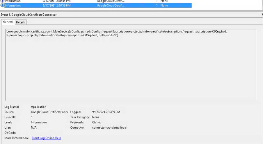 On the Google Cloud Certificate Connector event viewer, look for the following events: