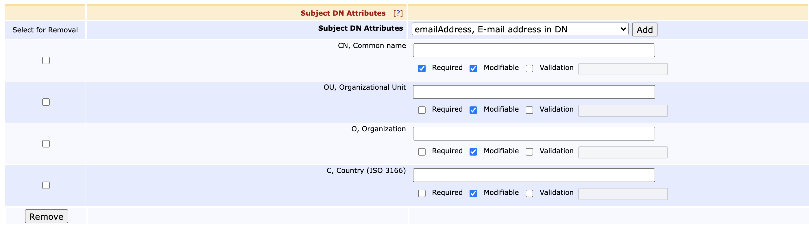 Ensure that the following Subject DN Attributes and Subject Alternative Names values are available in the End Entity profile (EJBCA RA Functions > End Entity Profiles):