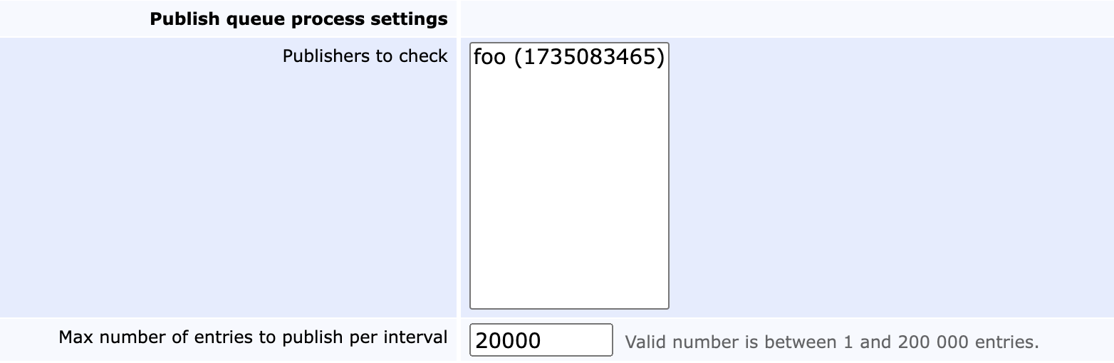 | Max number of entries to publish per interval | The max number of entries that will be handled per publishing interval. Default value is 20 000, but can be set up to 200 000. Only successful attempts are counted, and the entries are retrieved from the database in batches of 100. |