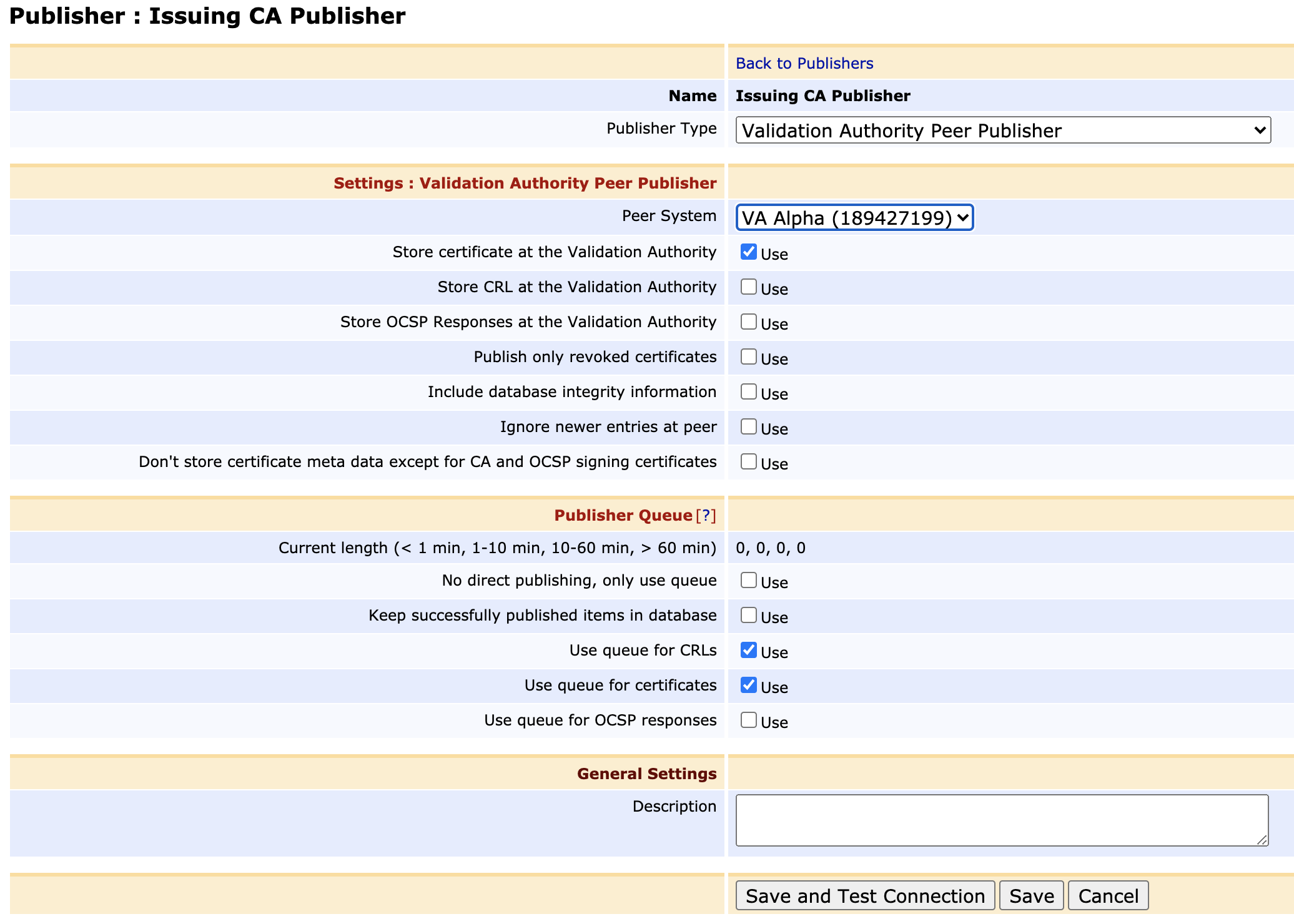 For more information about the Validation Authority (VA) Peer Publisher, see Validation Authority Peer Publisher and for general information on publishers, see Publishers Overview.