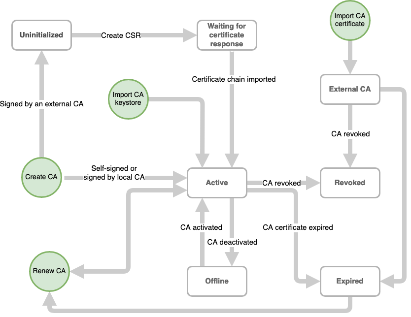 - Revoked - The terminal status of a CA that has been manually revoked. Once a CA is revoked it is not possible to perform any operations with it (e.g. sign certificates or renew the CA certificate).