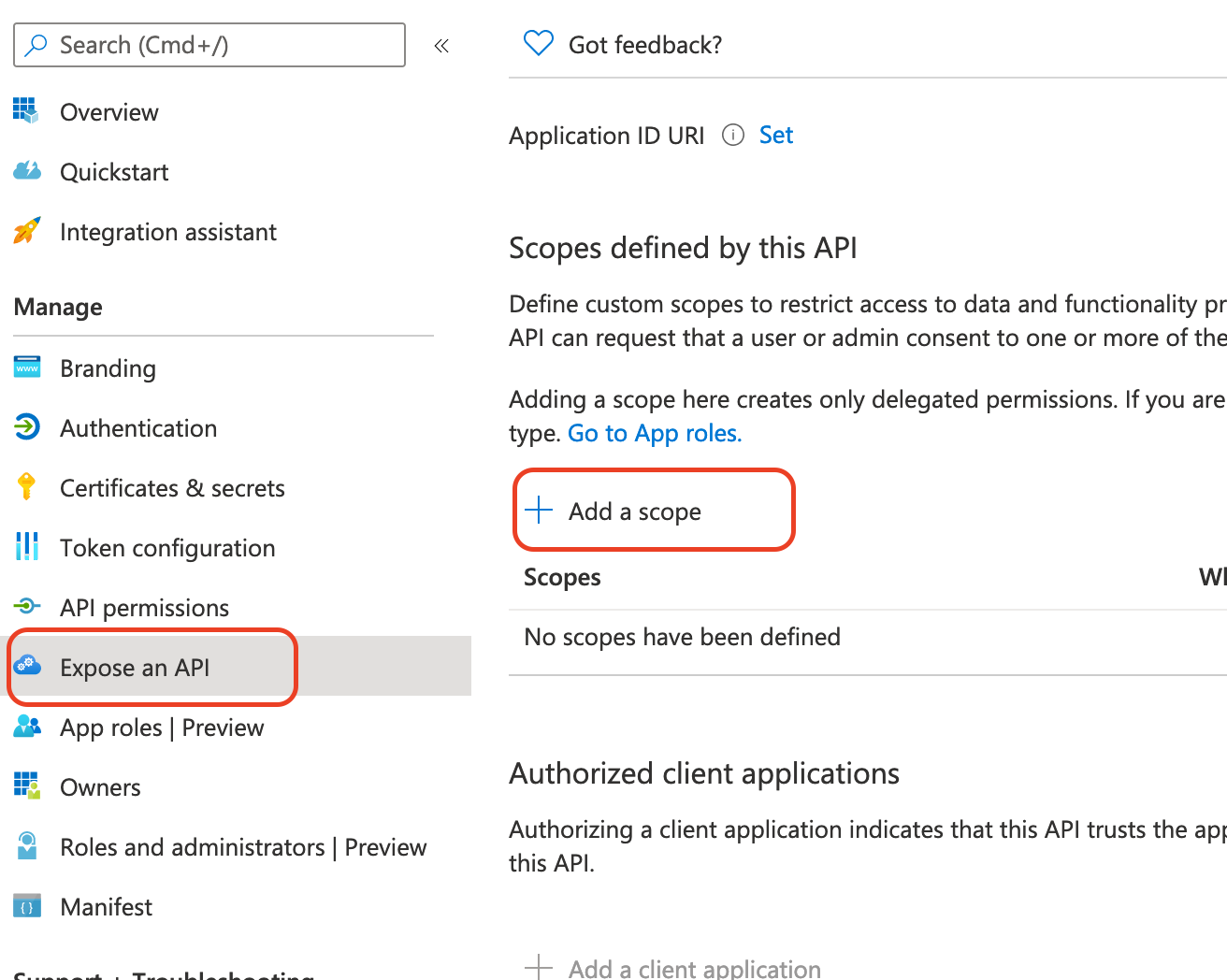 - In the left-hand navigation pane, select Expose an API, and then click Add a scope.