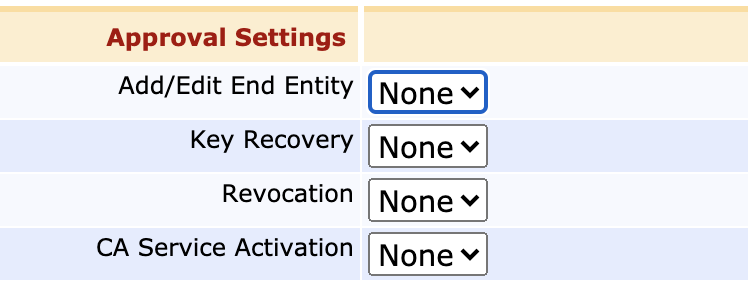If you want to have several trusted administrators sign off on the issuance of a new CA certificate, configure Approval Profiles in the Approval Settings section.