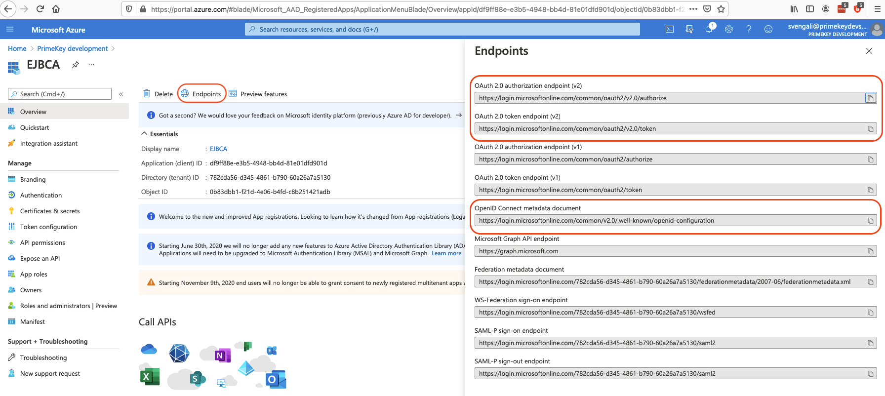 - On the Azure portal EJBCA Overview page, click Endpoints and open the OpenID configuration.