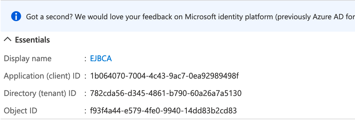 - Azure AD assigns a unique application (client) ID to EJBCA and the Azure portal displays an EJBCA Overview page.