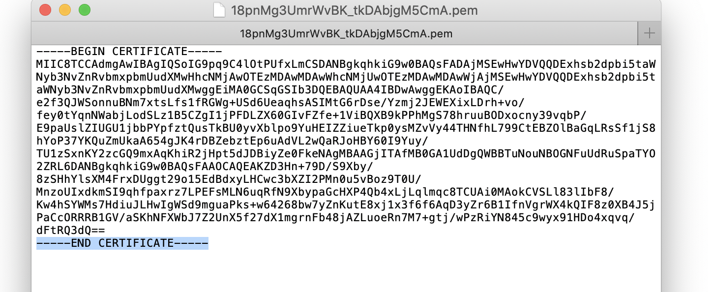 - Copy the certificate value, copy it to text file, and prefix it with "-----BEGIN CERTIFICATE-----", suffix it with "-----END CERTIFICATE-----", and then save the file.