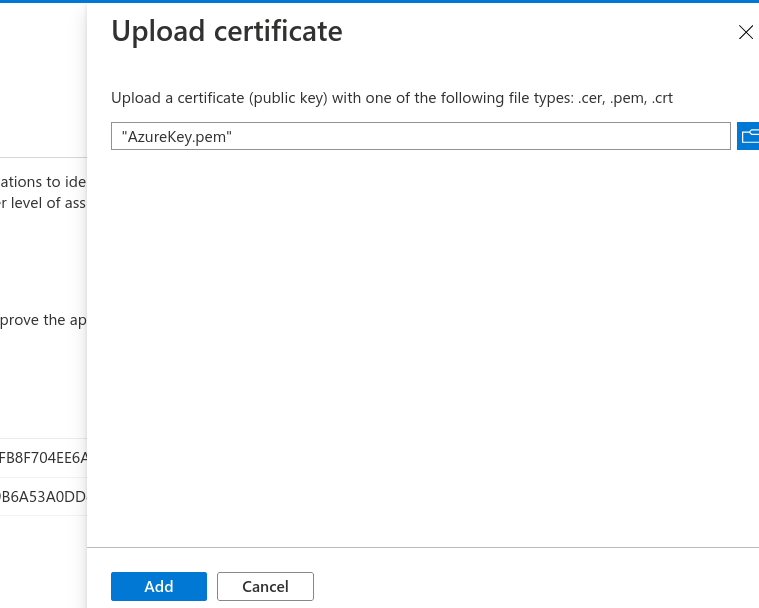 - Go to Certificates & secrets in Azure and click Upload certificate. Select the PEM file downloaded above and click Add.