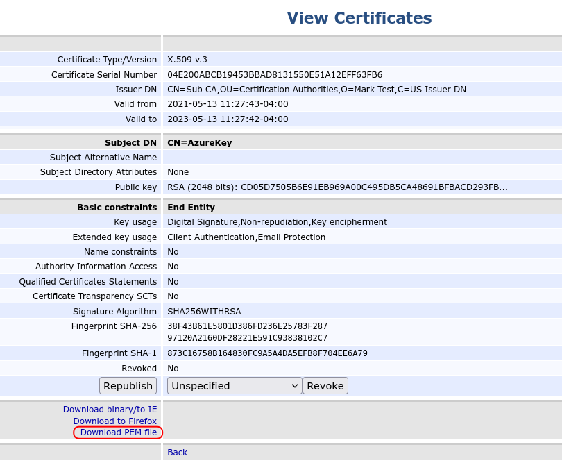 - Select Download PEM file and save the certificate as a PEM file on the local file system.
