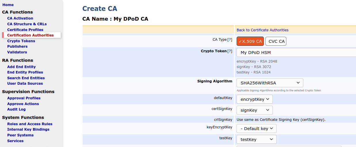 With the created crypto token, you can now go ahead and create CAs, using keys on the DPoD HSM.