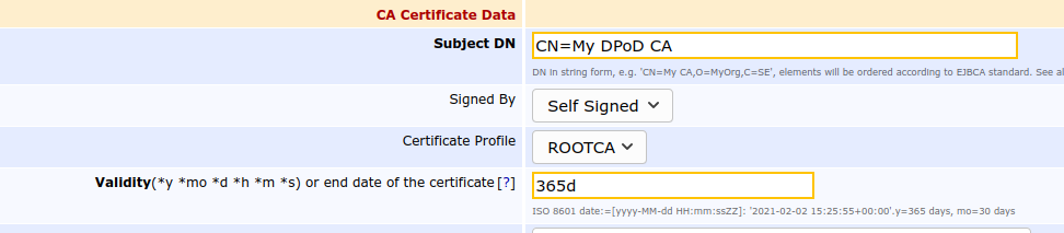 4. Enter a Validity in days, for example 365d for one year validity of the CA.