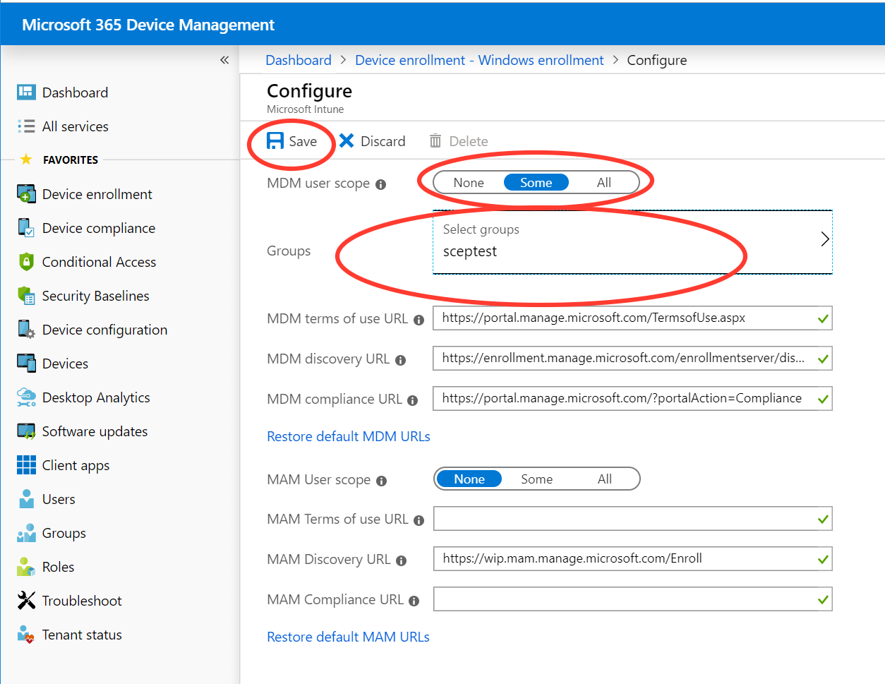 On the Configure page, change the MDM user scope to Some, select group sceptest, and then click Save to store the configuration.